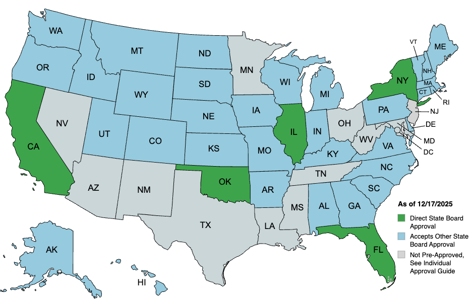 This course is eligible for 1.5 CEU contact hour in the green and blue states in the map below. If you are licensed in a gray state and would like course materials to submit for individual approval, please email [email protected]